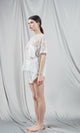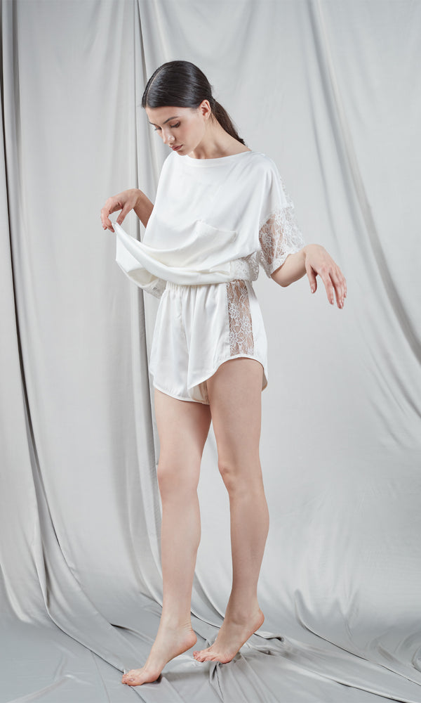 Die Hose besteht aus elfenbeinfarbenem Satin, einem elastischen Stoff für mehr Komfort und Flexibilität. Das minimalistische Design und die luxuriösen Hosen sind vielseitig einsetzbar und bieten Ihnen die Möglichkeit, sich zu entspannen, damit Sie ein einzigartiges, elegantes Pyjama-Set zusammenstellen können. Die detaillierten Details des Bildes umfassen einen feinen Akzent, subtile Akzentuierung und eine sorgfältige ästhetische Gestaltung.