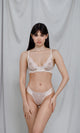 Un soutien-gorge à décolleté plongeant en V, alliant élégance et sensualité, sublimé par une broderie personnalisée dans des tons beiges et orné du logo distinctif de la marque sur un tulle fin et transparent. Les bonnets festonnés apportent une touche ludique, tandis que les bretelles élastiques réglables assurent un maintien optimal. Pour une parure irrésistible, associez-le à notre culotte assortie, dans le même style raffiné.