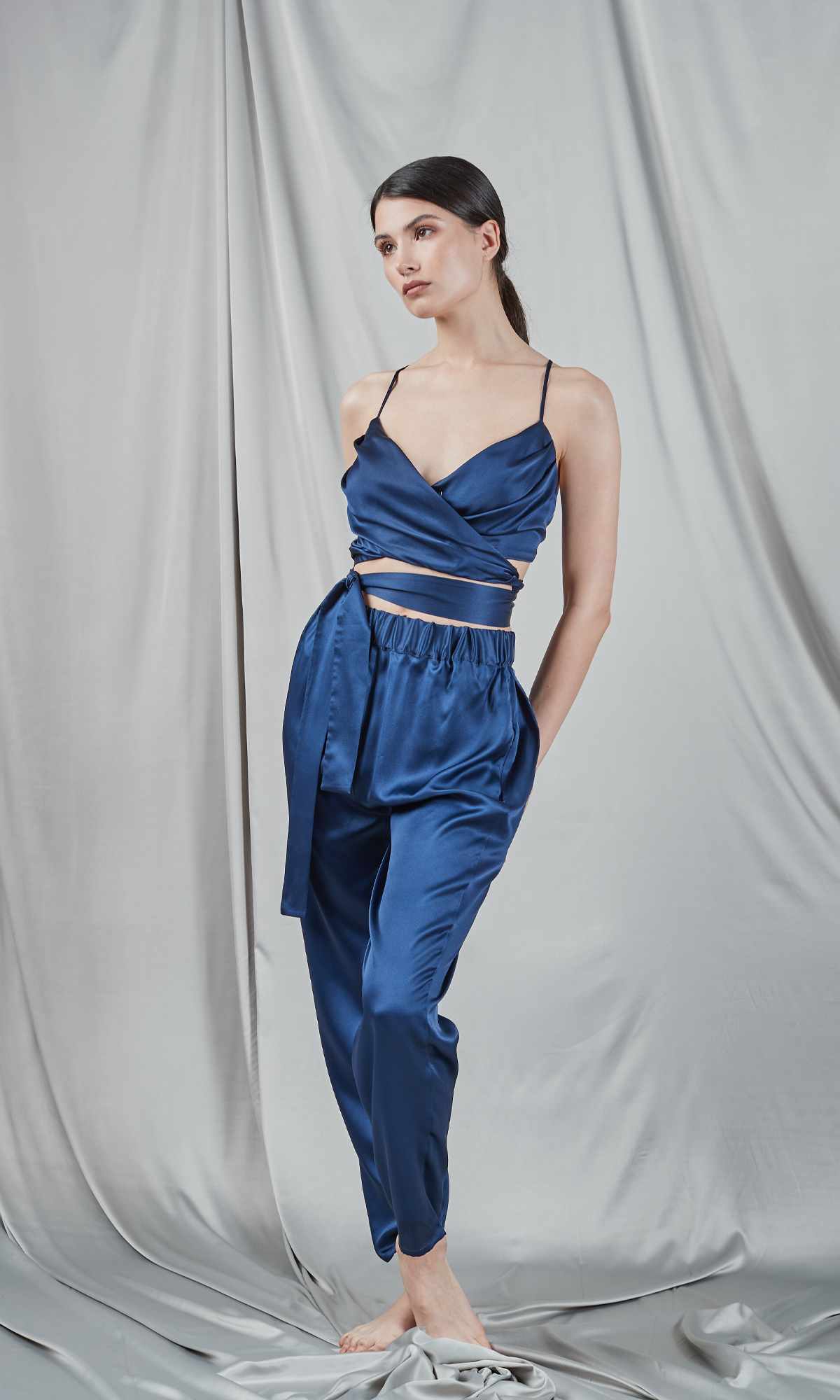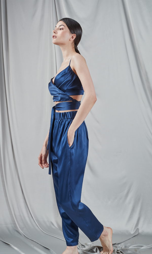 Pantalon bleu marine fuselé en satin, au toucher doux et à l'allure élégante. Sa taille élastiquée assure confort et silhouette flatteuse. La coupe simple, aux lignes épurées et resserrées aux chevilles, offre une esthétique moderne et raffinée. Ce pantalon se porte en toutes occasions, des tenues décontractées chics aux ensembles de soirée sophistiqués.