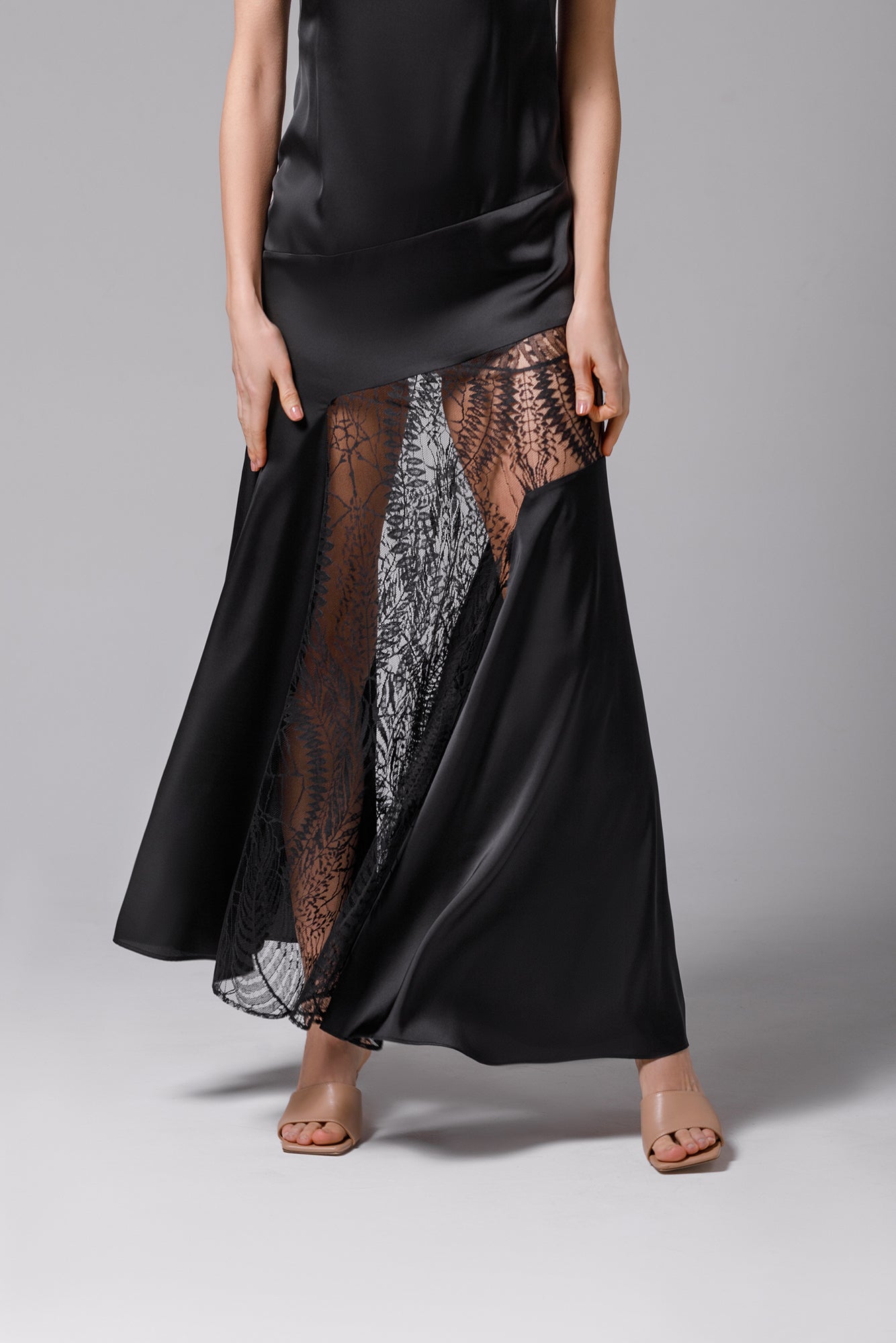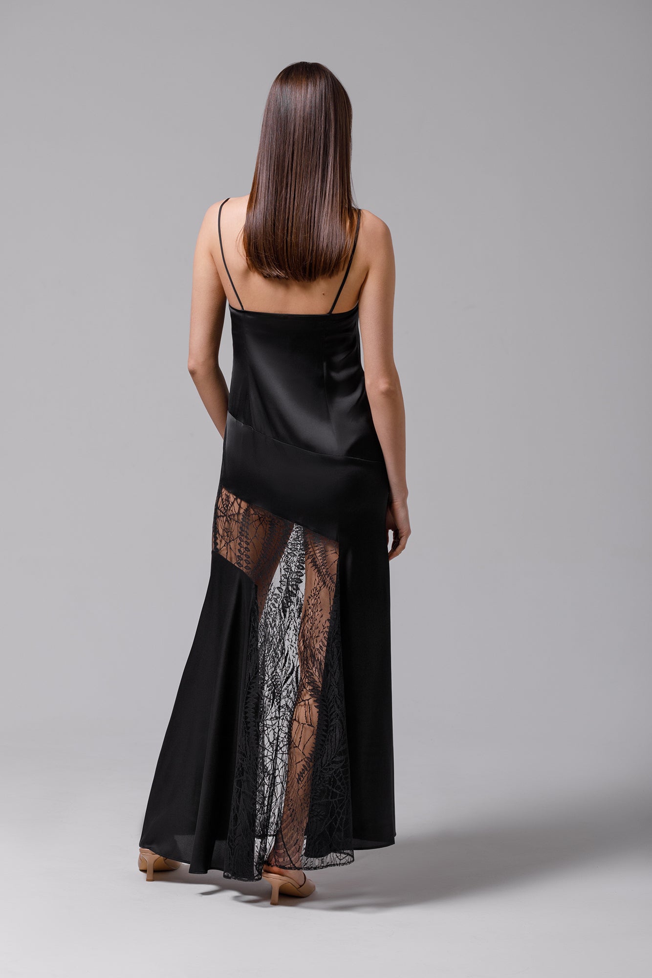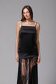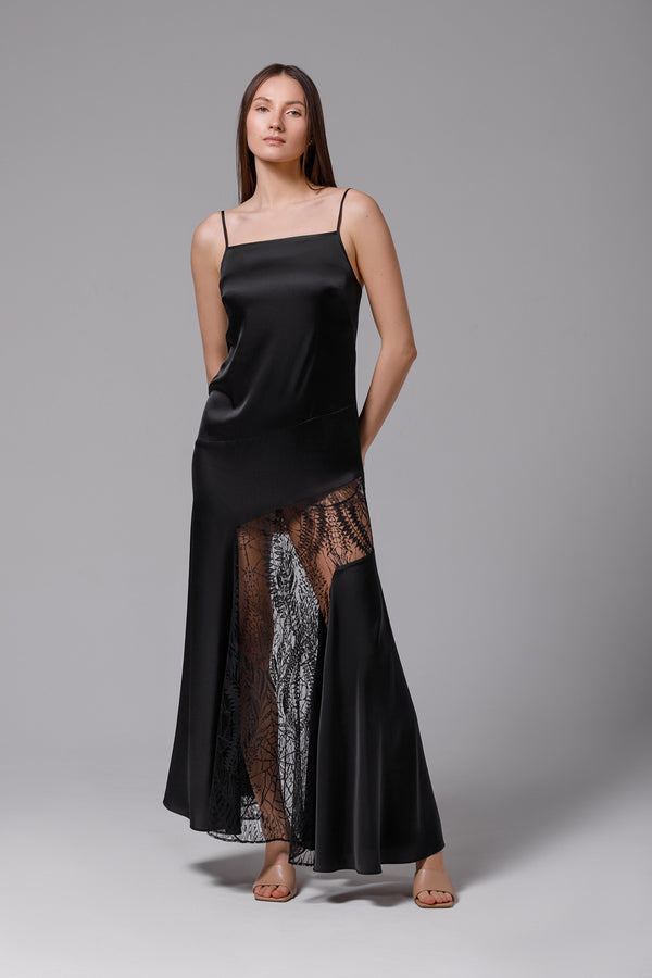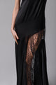 Robe longue en satin noir avec dentelle