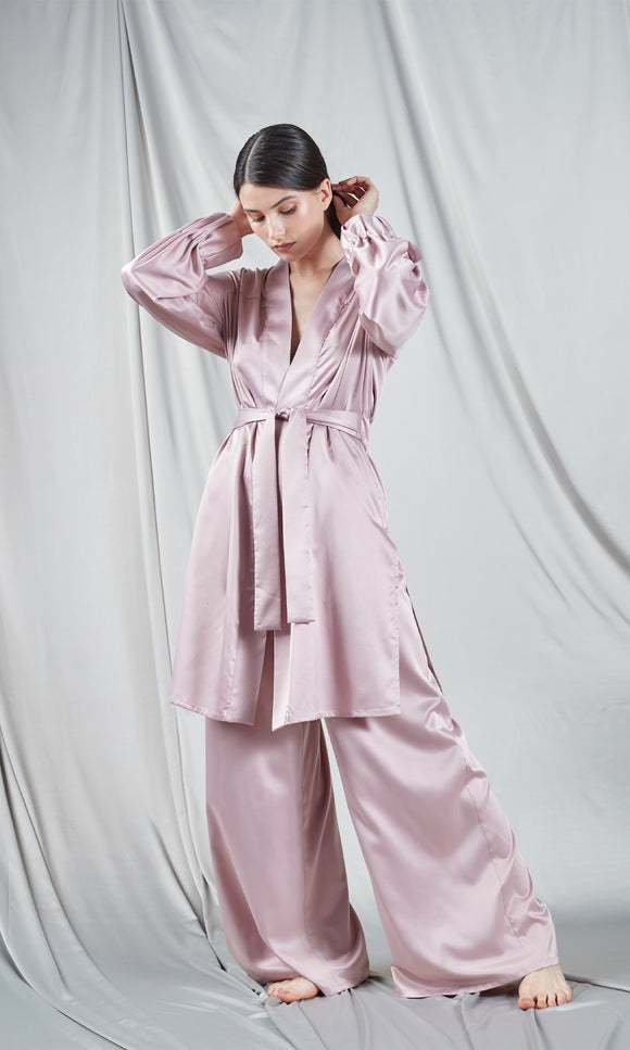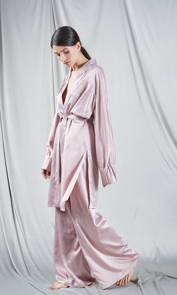 Kimono long en satin rose pâle