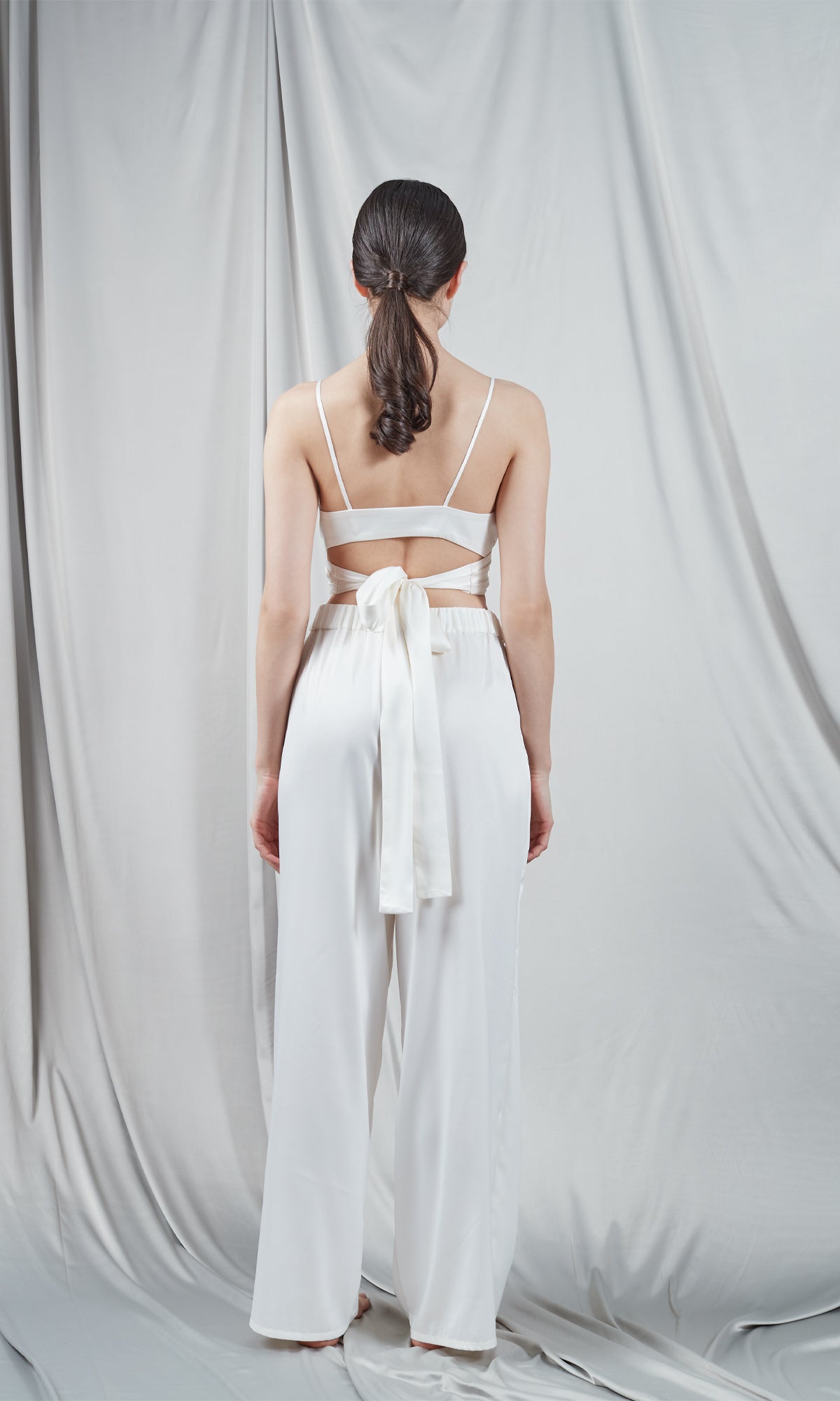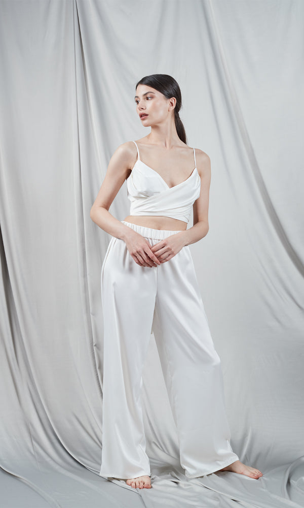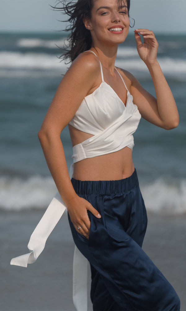 Ce top ivoire se distingue par son élégante simplicité féminine. Confectionné en satin, il met en valeur la délicatesse et la finesse du tissu, lui conférant une allure raffinée. Son décolleté en V profond et ses fines bretelles sculptent avec grâce la nuque et les épaules. Sa coupe cache-cœur crée un effet polyvalent et original, tout en apportant texture et volume. Ample et confortable, il offre une grande liberté de mouvement et se prête aussi bien aux tenues estivales qu'aux événements formels où une allure chic est de mise.