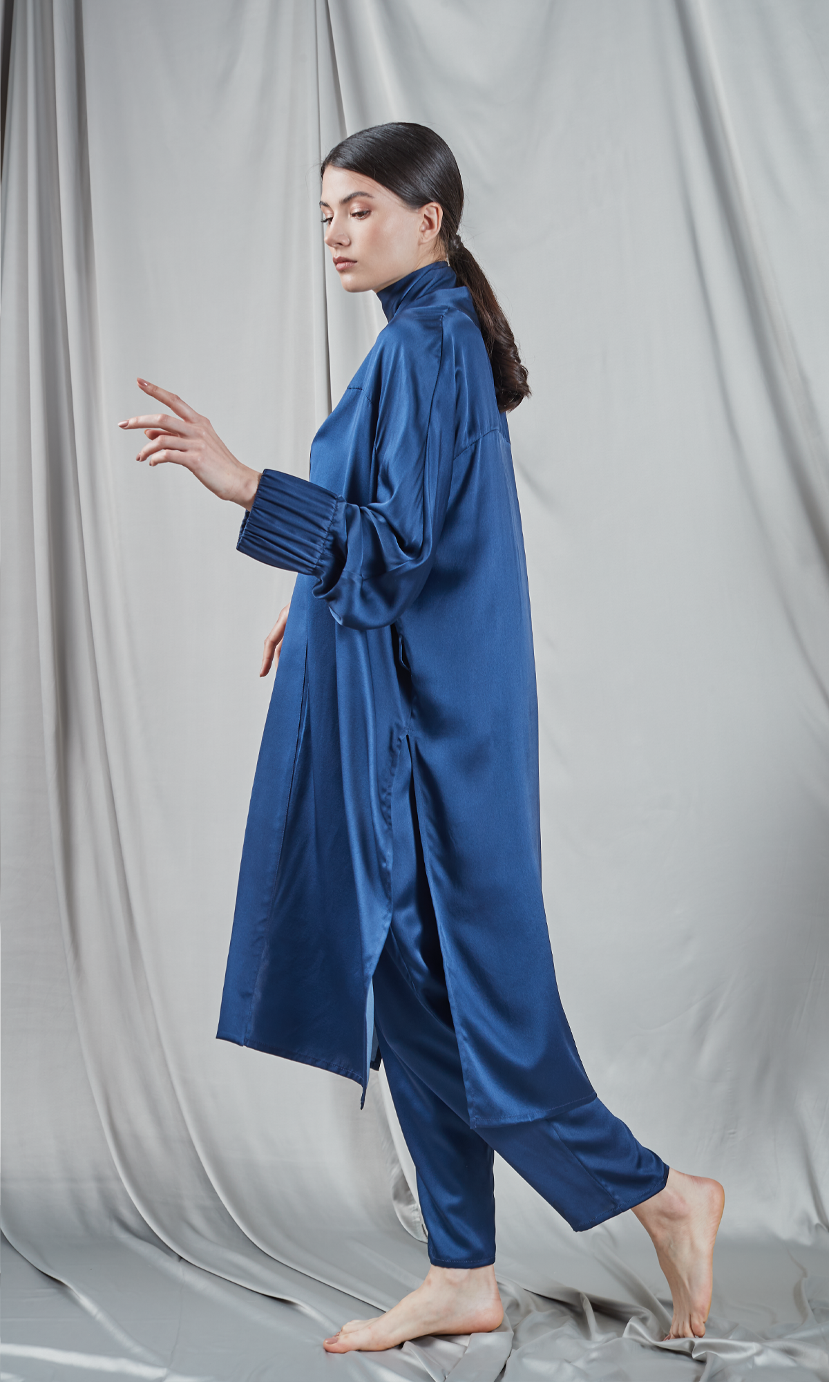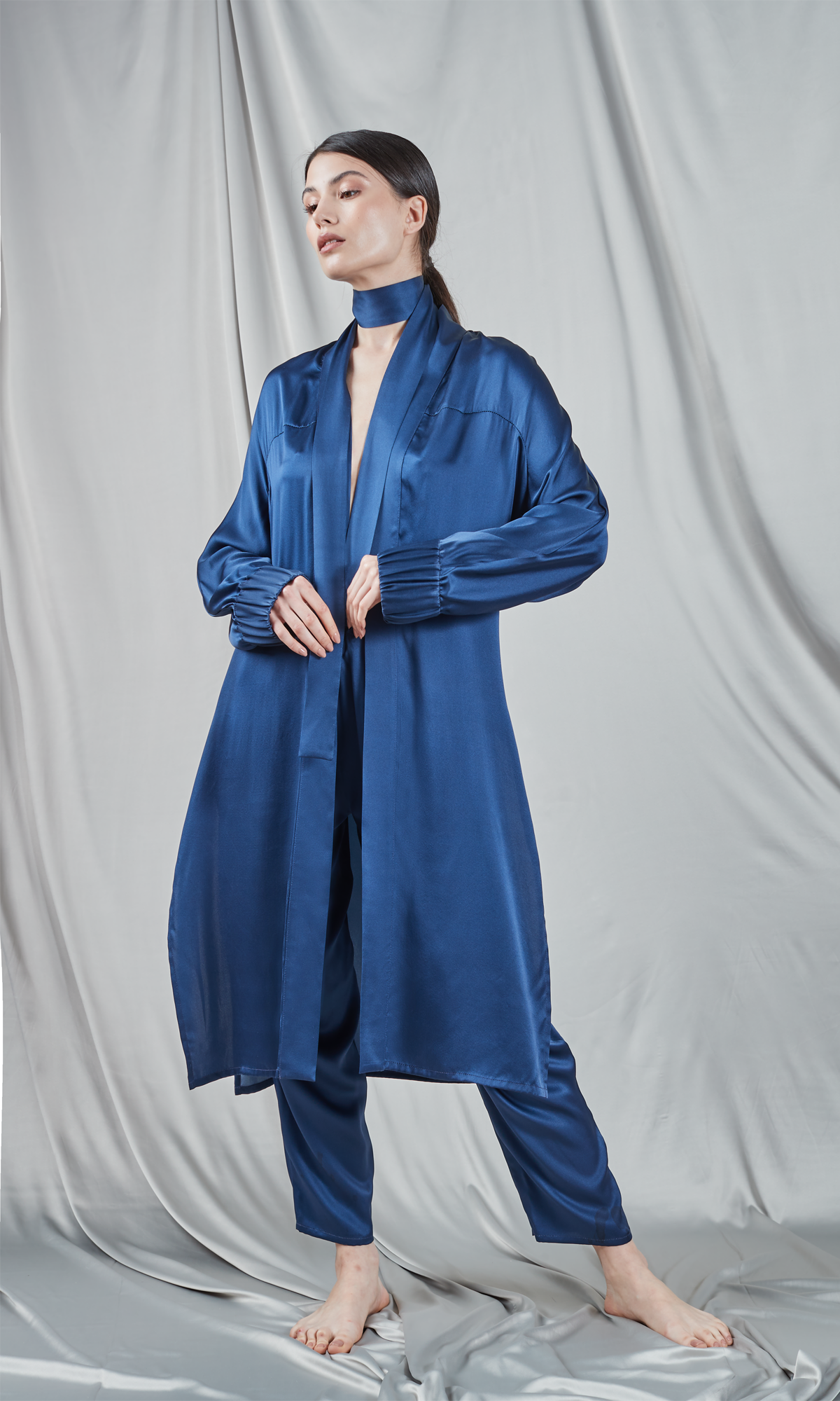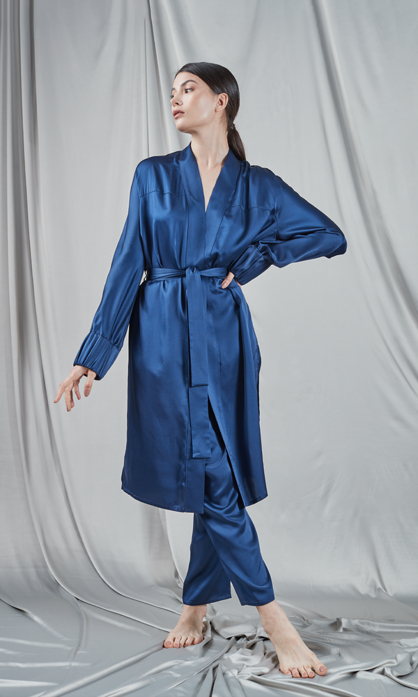 Kimono in een prachtige marineblauwe tint, een toonbeeld van elegantie en comfort. Gemaakt van glanzende zijde, wat zorgt voor een luxueuze uitstraling en een soepele valling. Het eenvoudige ontwerp met strakke lijnen wordt verfraaid door een hoge kraag die een eigentijds detail toevoegt. De lange mouwen zijn afgewerkt met elastische manchetten, wat een subtiel contrast in vorm en textuur creëert. De kimono is aan de voorkant open en kan in de taille worden vastgemaakt met een bijpassend koord, zodat de pasvorm naar wens kan worden aangepast. Dit kledingstuk kan in diverse situaties worden gedragen, of het nu als een extra laagje elegantie over een avondoutfit is of als basisstuk voor een casual outfit thuis.