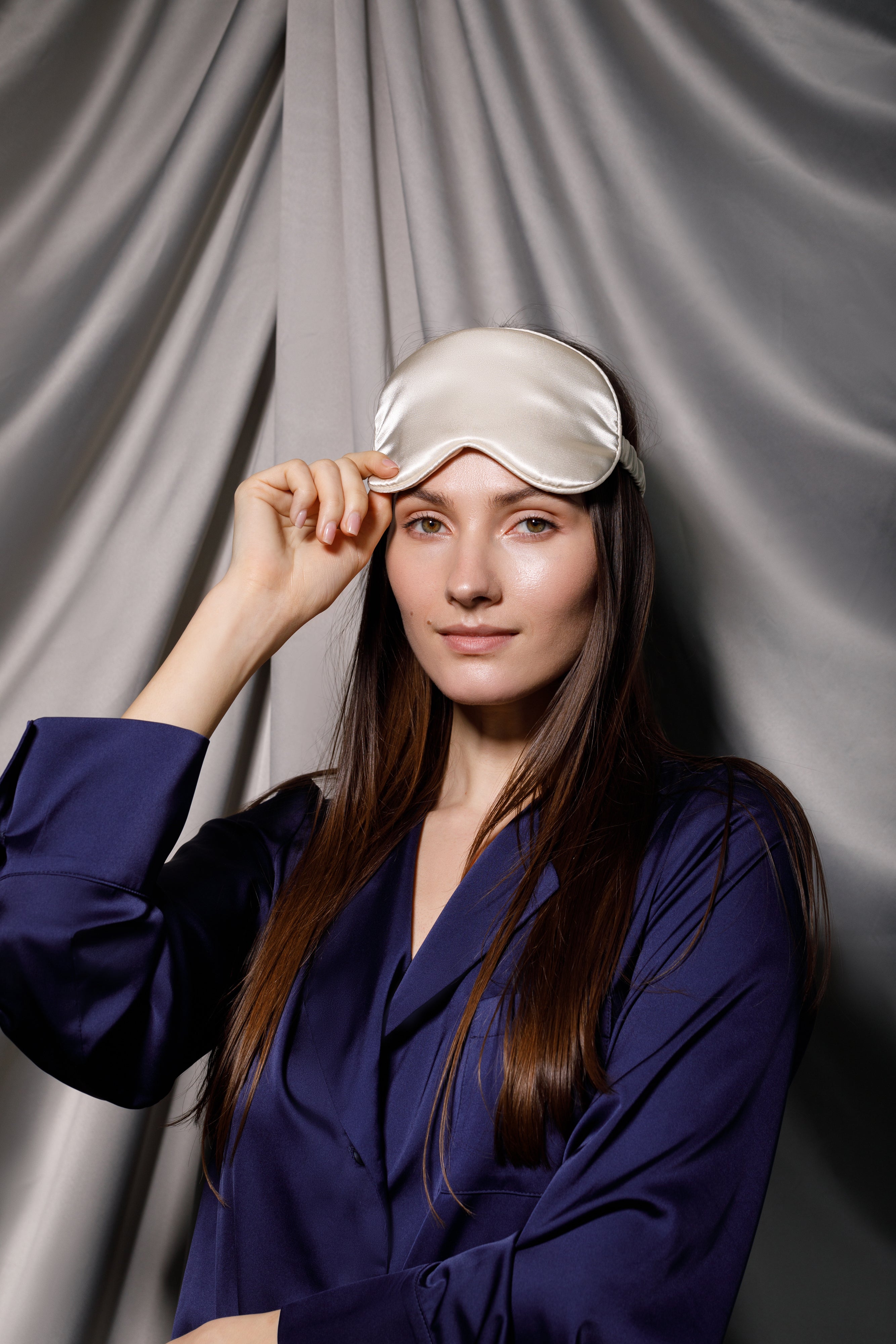 Complete your luxurious sleep experience with our bestselling sleep mask. This champagne-colored mask is made of satin, ensuring ultimate comfort and being gentle on your skin. Its design follows the same distinct contrasting accents of our collection, offering not only quality rest, but also refined style. It is the essential accessory for a deep and pampered night's sleep, perfectly complementing your silk pajamas set.