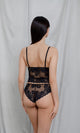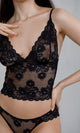 Discover our black lace top, encrusted with sublime roses. Made from incredibly soft stretch lace, this top is an elegant and refined choice. With a scalloped edge and a flirty V-shaped hem, it adds a touch of subtlety and charm to any outfit. The straps are adjustable to perfectly fit your contours, and the top is unlined for added comfort.
